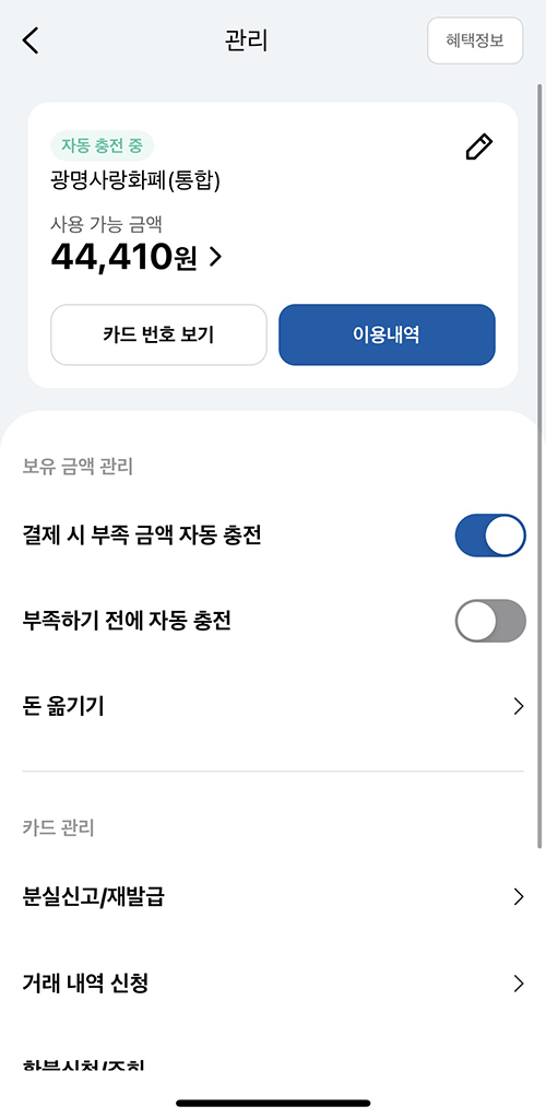 (스크린샷을 보면 자동충전 적용되어 있는 상태이다.)
